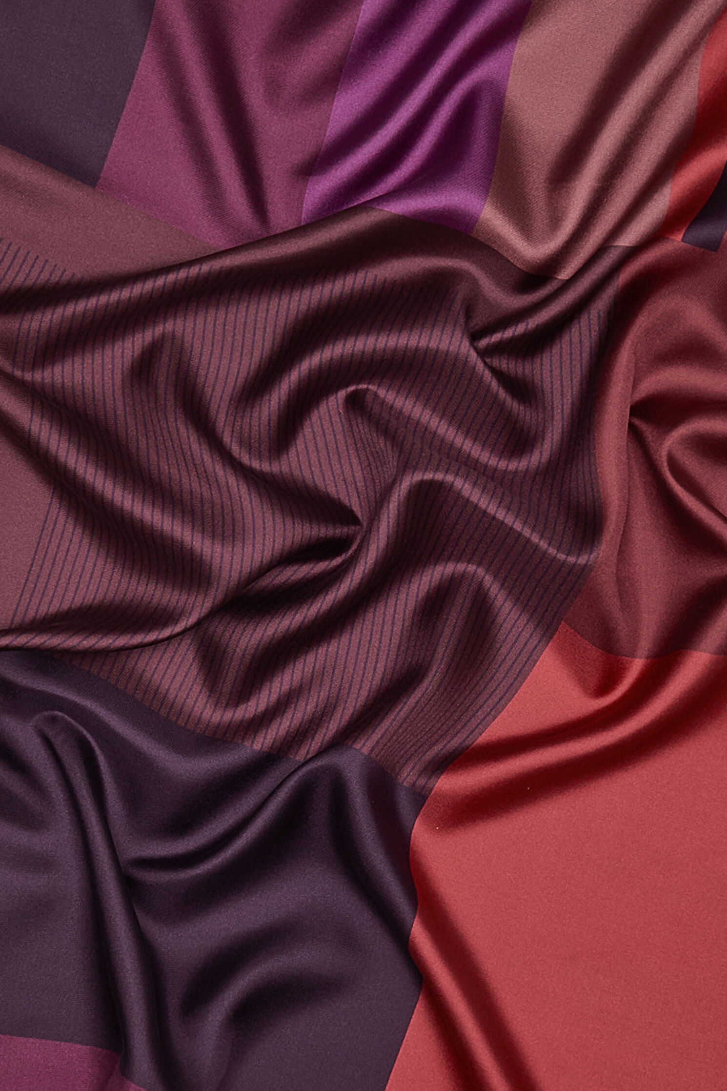 Mürdüm, koyu kırmızı, mor renkte desenleri ile dikkat çeken W Collection gavroş, ipek kumaştan üretilmiştir. Bu tasarım, 90 cm x 90 cm ölçüye sahiptir.