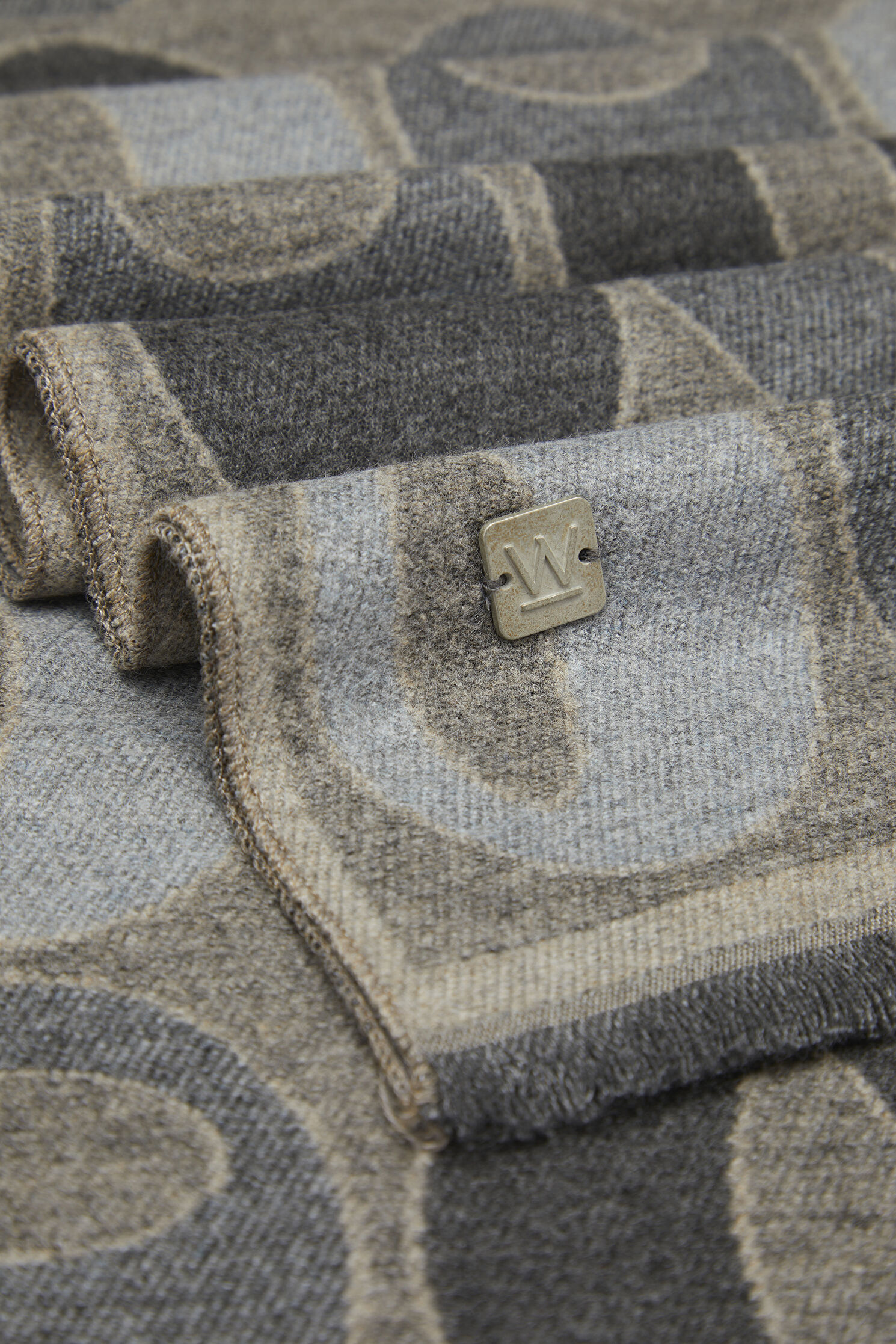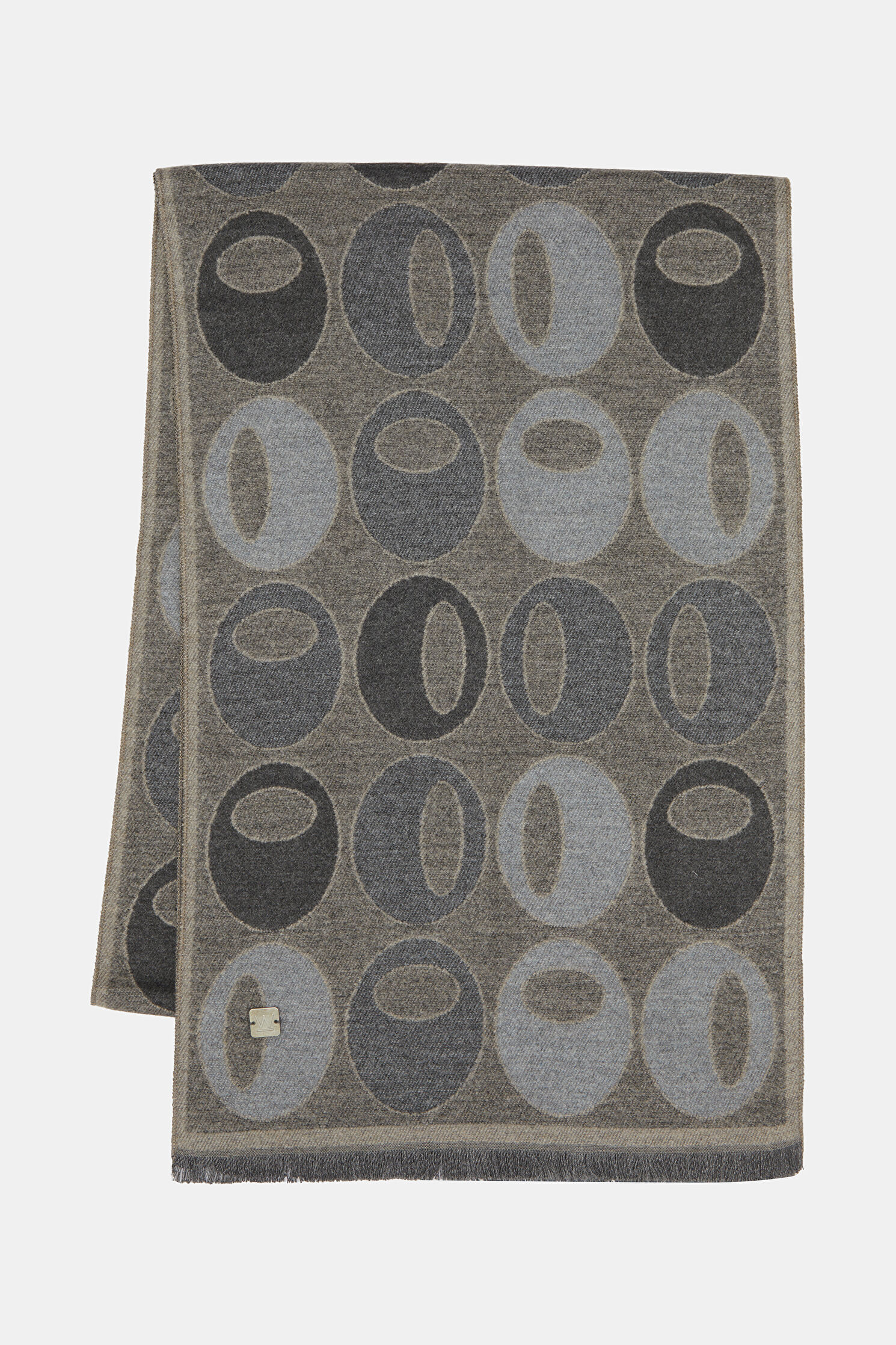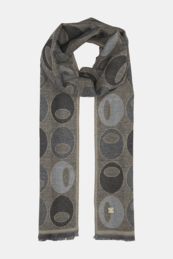 Bej, gri renkli W Collection kaşkol, desenleri ve püskül detayları ile dikkat çekiyor.