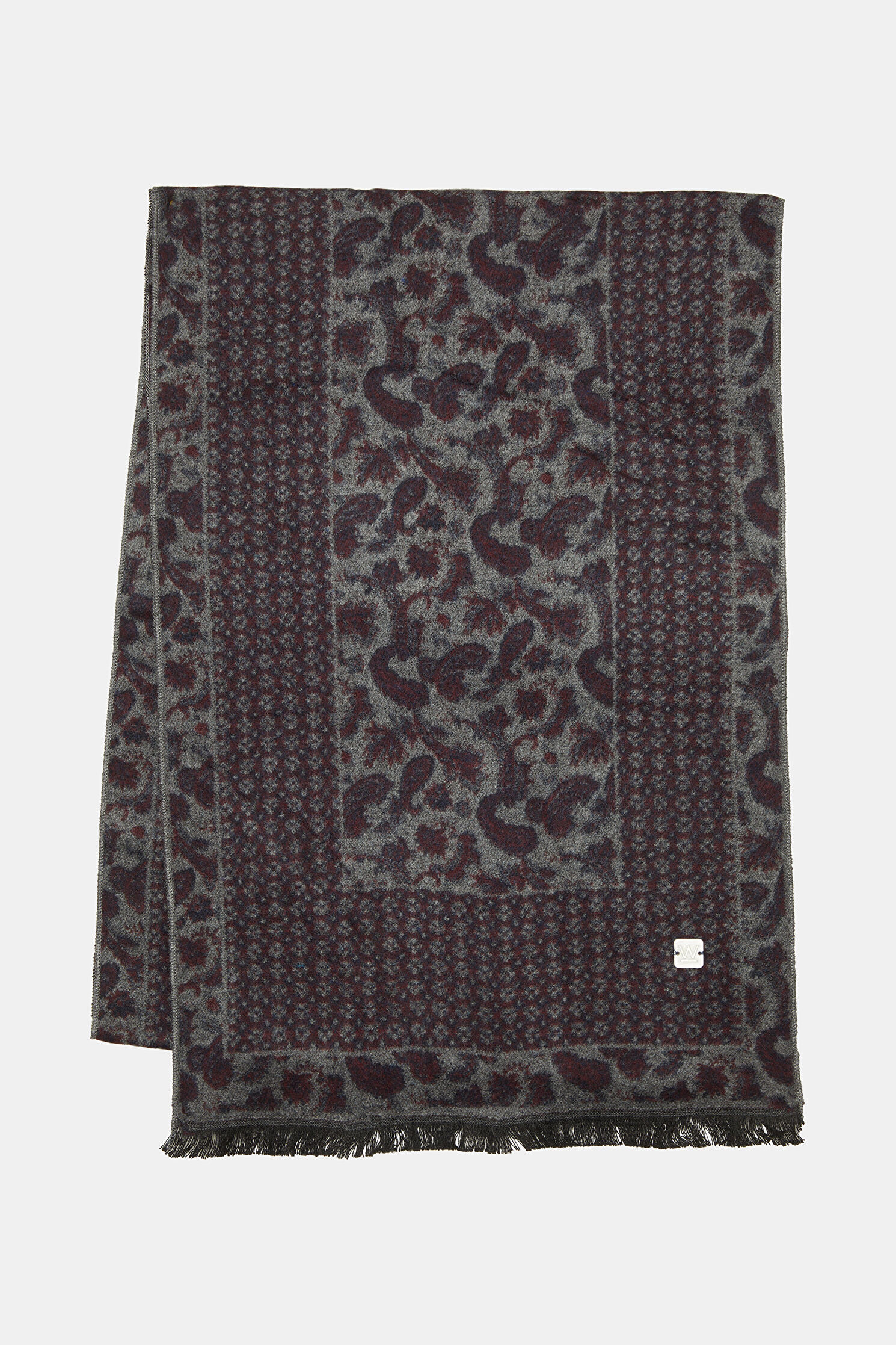 Püskül detayına sahip olan gri ve bordo renkli W Collection kaşkol; şal deseni ile dikkat çekiyor.