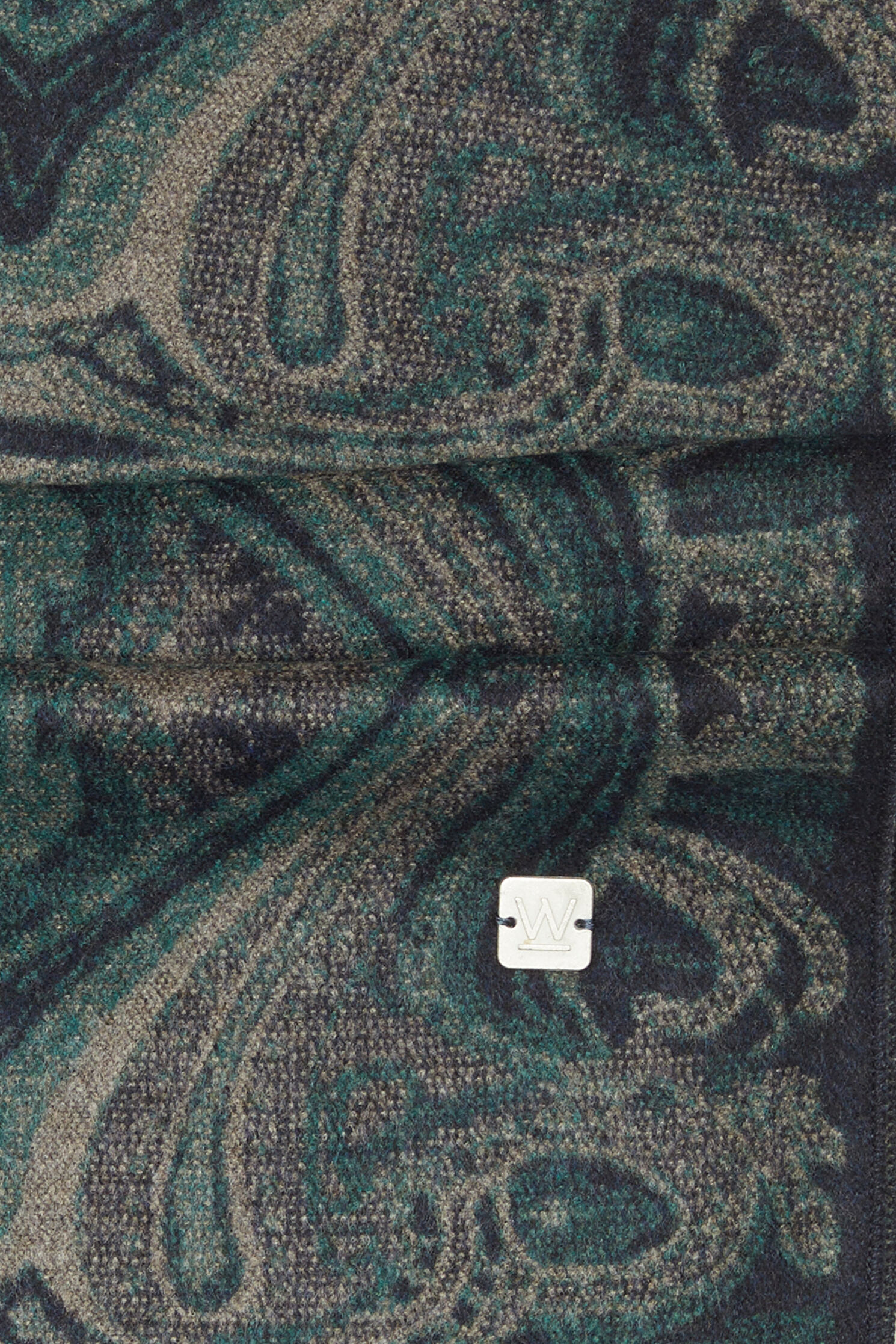 Püskül detayına sahip olan W Collection kaşkol, yeşil ve mavi renkli şal deseni ile dikkat çekiyor.