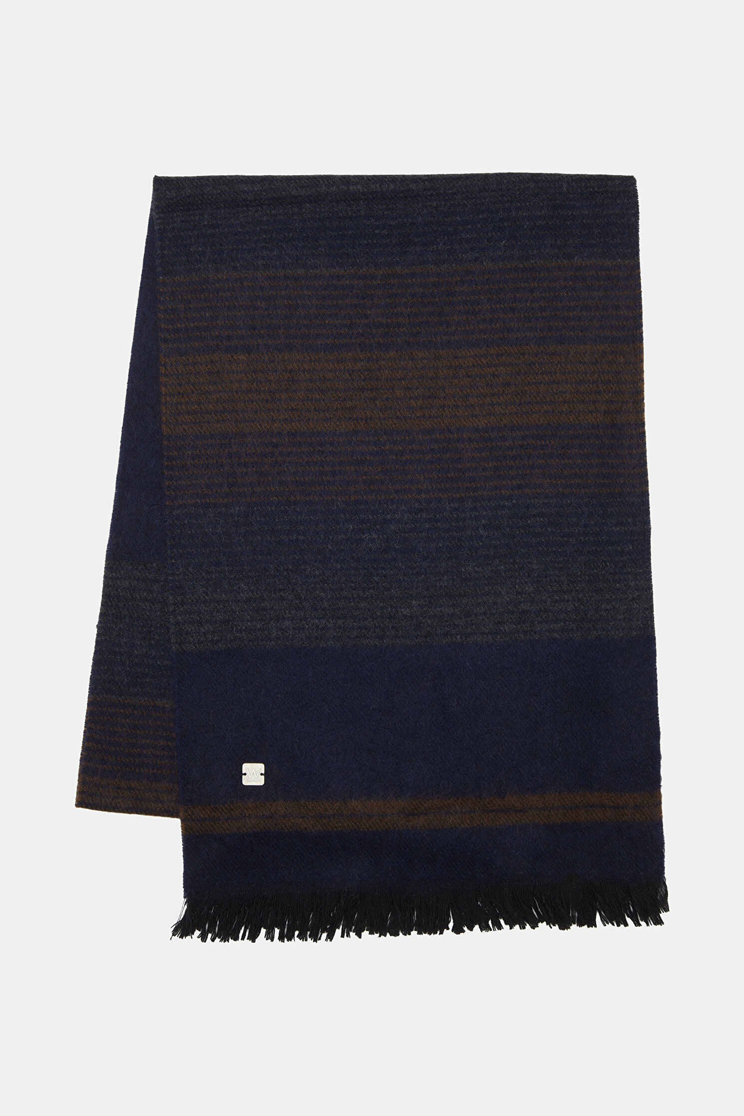 Koyun yünü karışımlı kumaştan üretilen kahve, lacivert renkli W Collection kaşkol; çizgi deseni ile dikkat çekiyor.