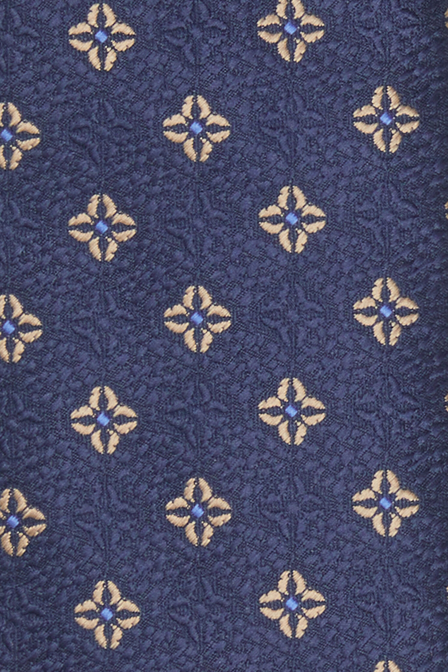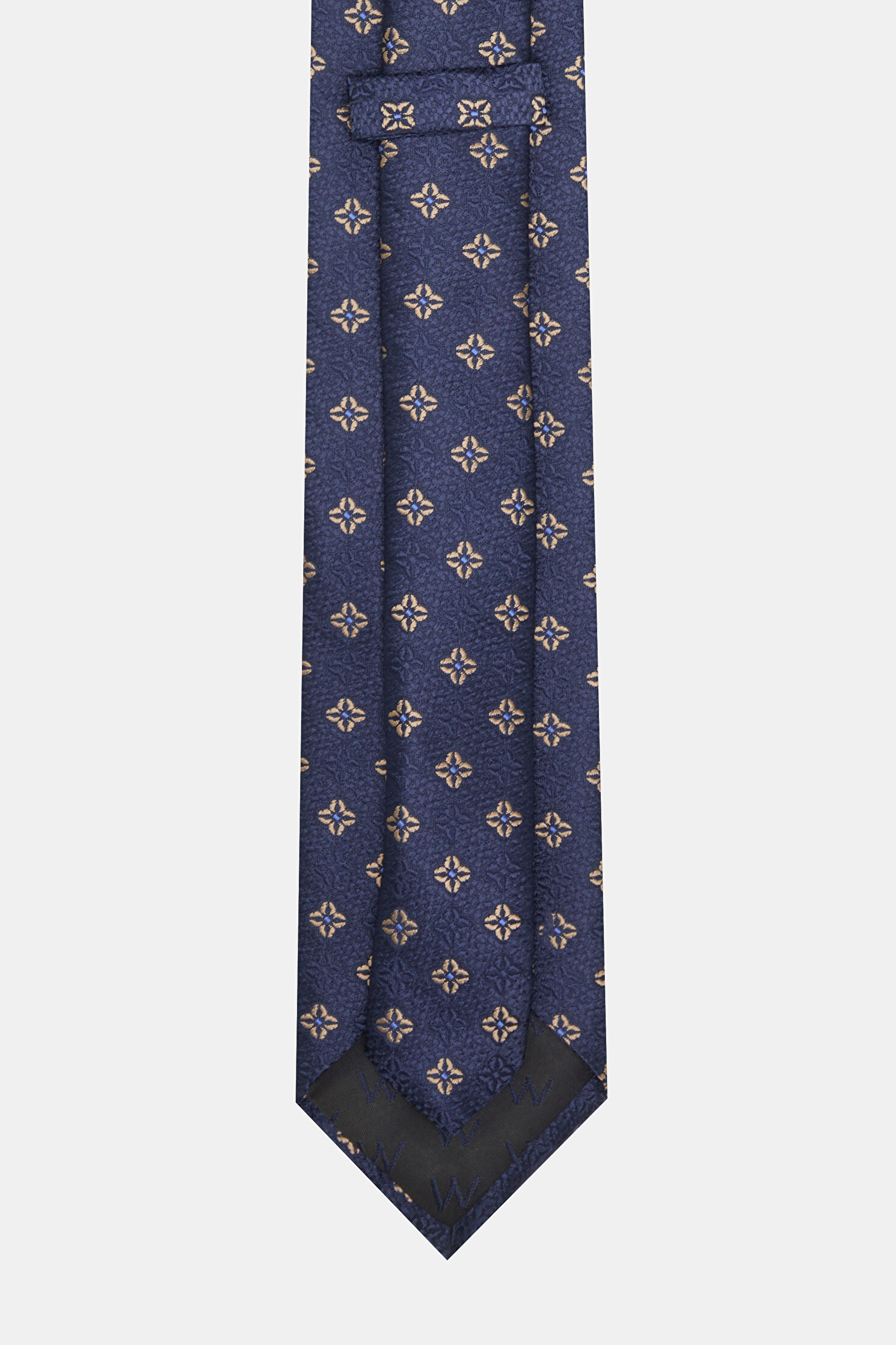 Lacivert ve bej renkli W Collection kravat, çiçek deseni ile öne çıkıyor.