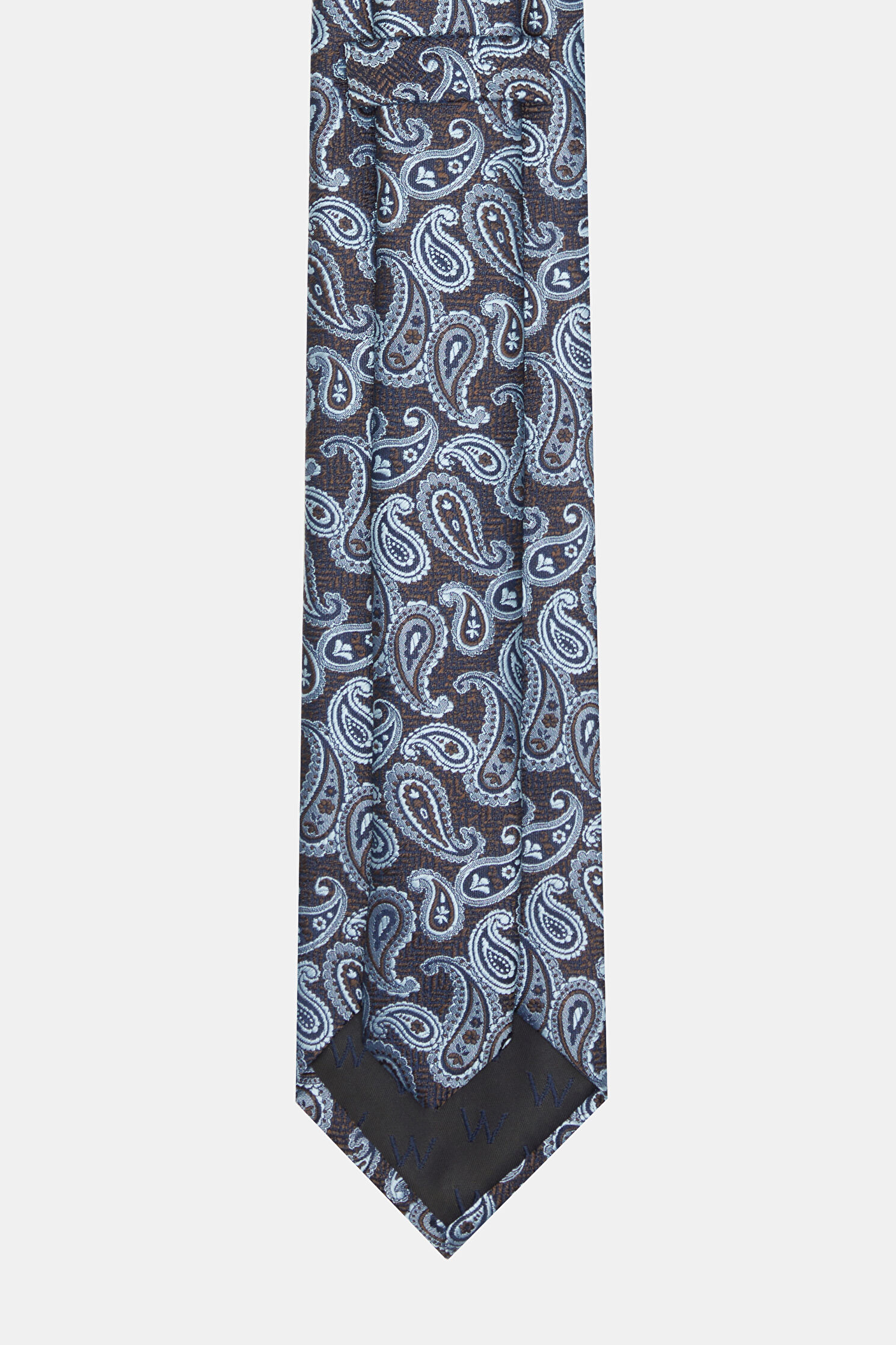 Kahve ve mavi renkli W Collection kravat, şal deseni ile öne çıkıyor.