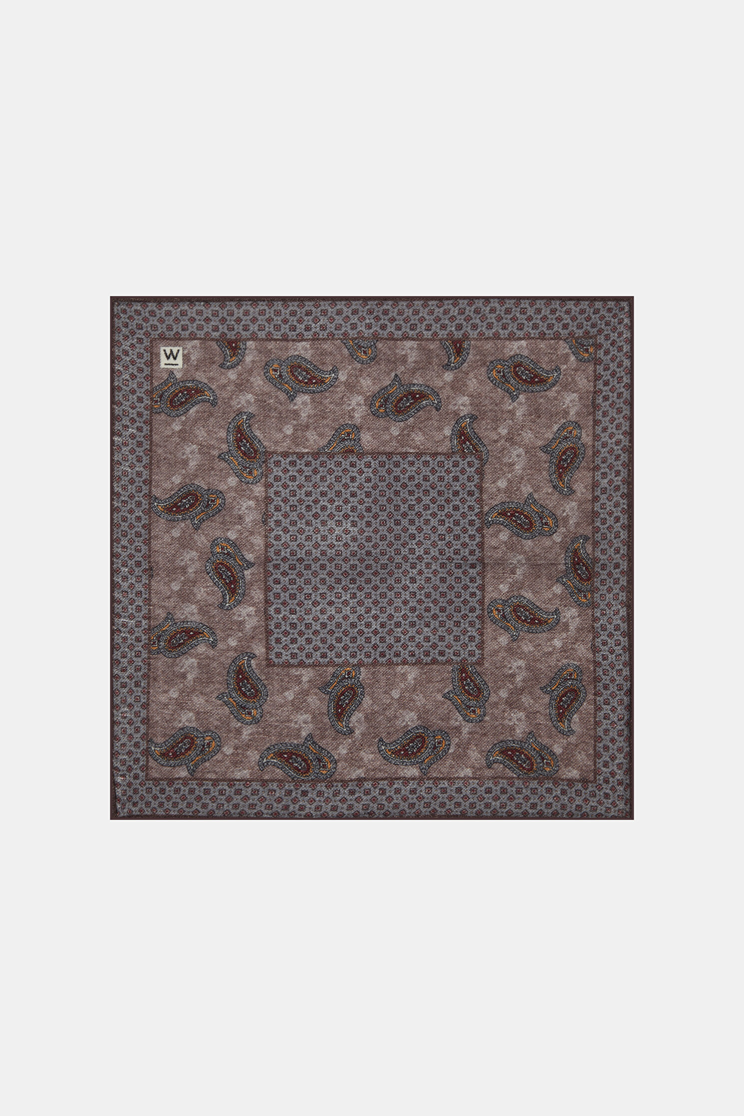 Kahve ve gri renkli W Collection mendil, çiçek ve şal deseni ile dikkat çekiyor.